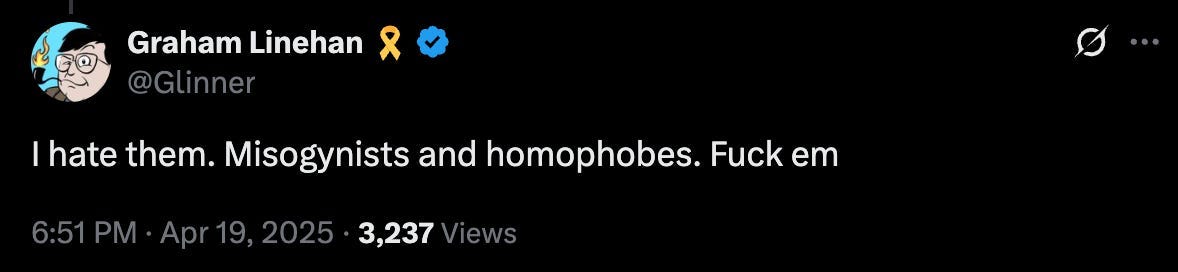 Finally, the third was a subsequent post to the one of the march. In it he wrote, “I hate them. Misogynists and homophobes. F**k em.”