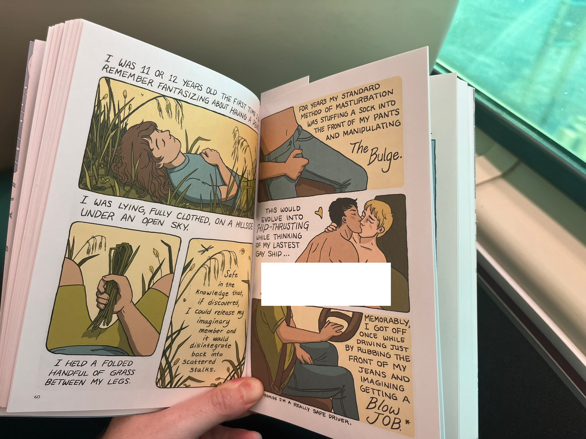 On top of this, it has a simulated oral sex act with two men on a separate page. It is pornographic material that is certainly not appropriate for children, though the publisher Oni Press keeps trying to get the book into school libraries in front of children.