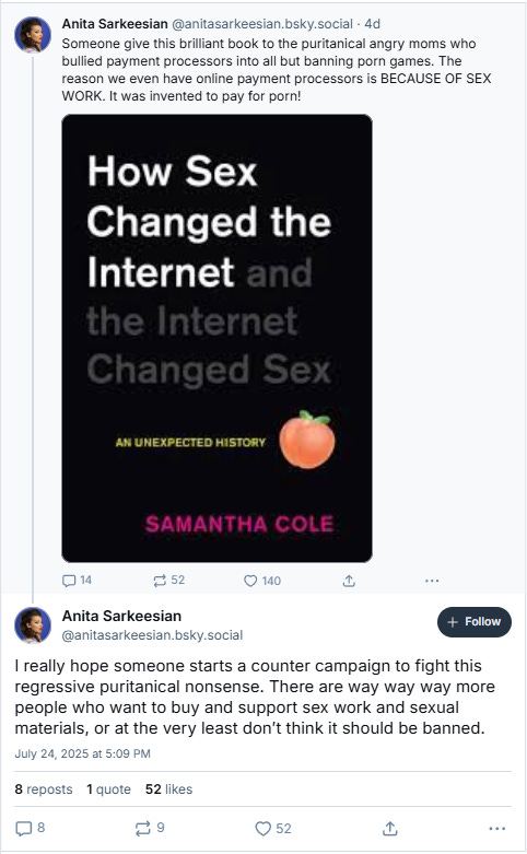 In a post to BlueSky, Sarkeesian wrote, “Someone give this brilliant book to the puritanical angry moms who bullied payment processors into all but banning porn games. The reason we even have online payment processors is BECAUSE OF SEX WORK. It was invented to pay for porn!”