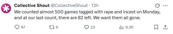 The organization shared that it had “counted almost 500 games tagged with rape and incest on Monday, and at our last count, there are 82 left. We want them all gone.”