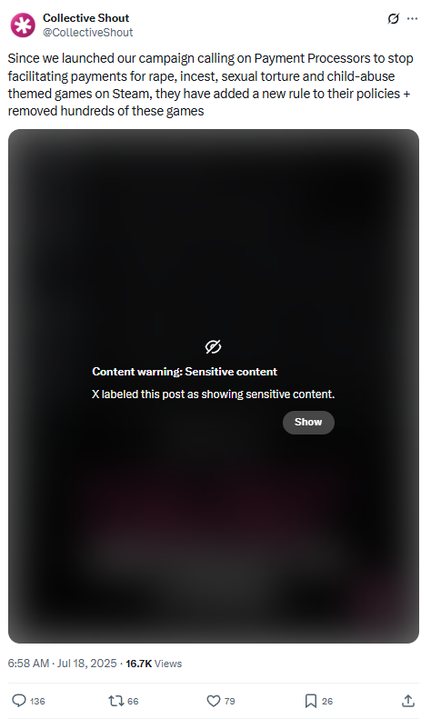 Following these games being banned from Steam, an Australian activist organization, Collective Shout, proclaimed responsibility for them being banned. It posted on X, “Since we launched our campaign calling on Payment Processors to stop facilitating payments for rape, incest, sexual torture and child-abuse themed games on Steam, they have added a new rule to their policies + removed hundreds of these games.”