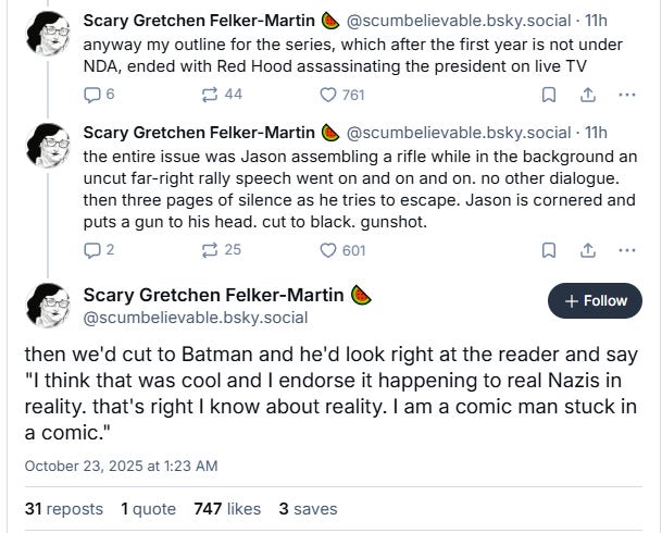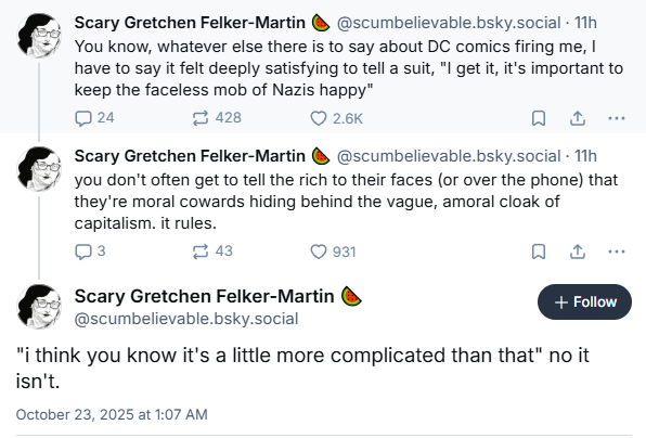 In a series of posts to BlueSky, Felker-Martin boasted about getting fired by DC Comics. He wrote, “You know, whatever else there is to say about DC comics firing me, I have to say it felt deeply satisfying to tell a suit, ‘I get it, it’s important to keep the faceless mob of Nazis happy.’”
