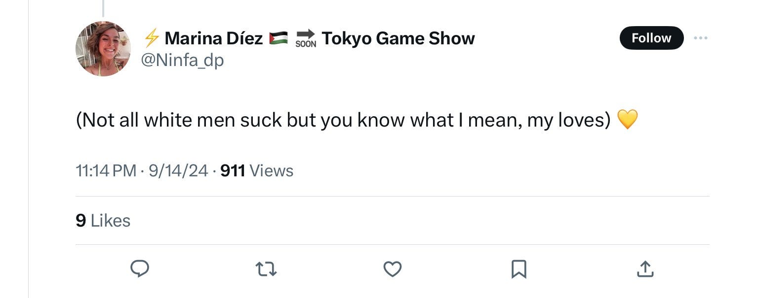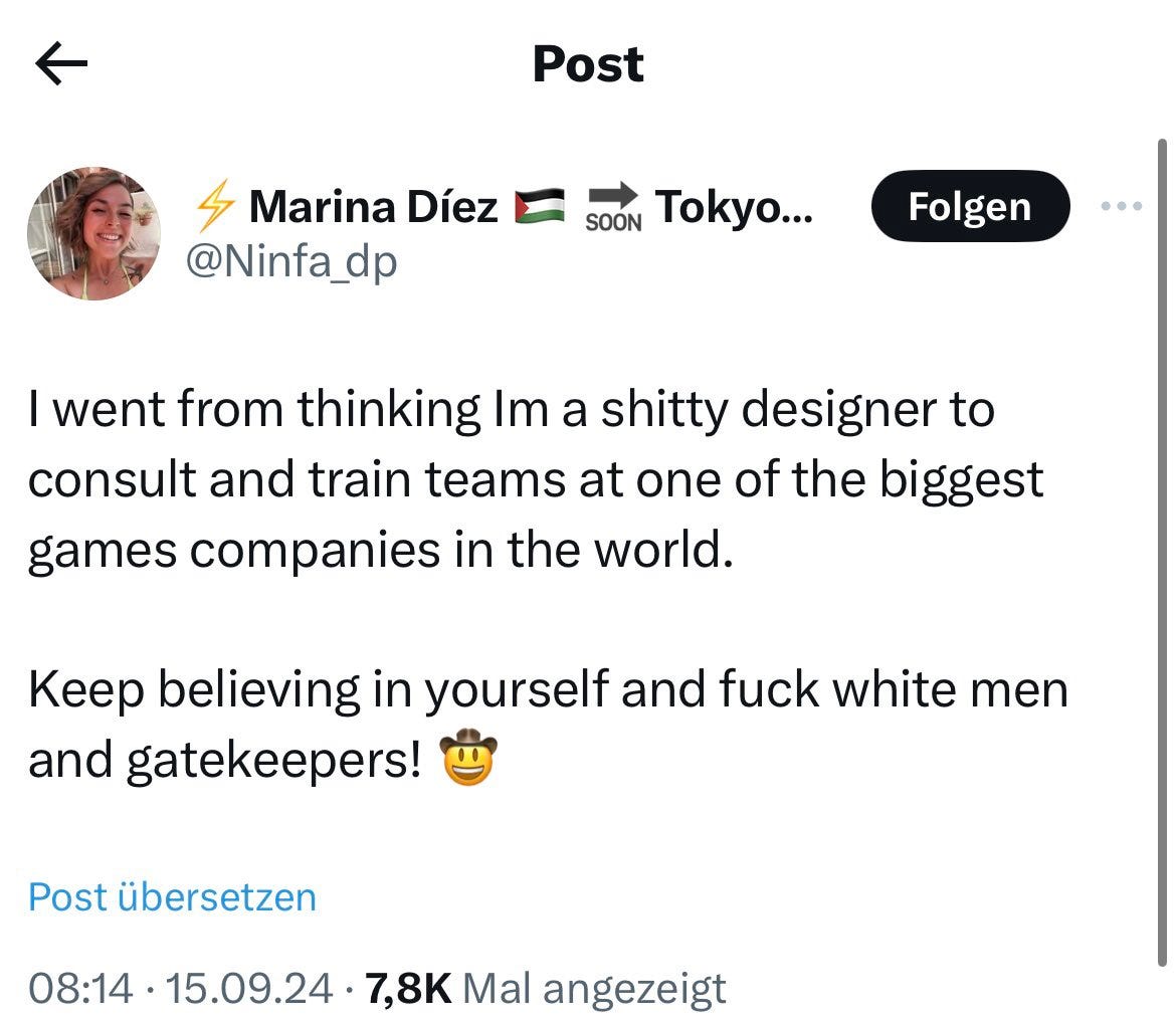 In a now-deleted post to X, Díez wrote, “I went from thinking Im a s****y designer to consult to and train teams at one of the biggest games companies in the world. Keep believing in yourself and f**k white men and gatekeepers.”
