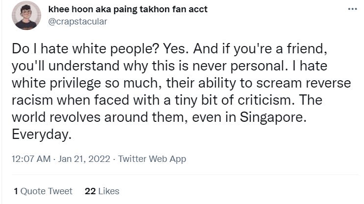 Chan wrote, “Do I hate white people? Yes. And if you’re a friend, you’ll understand why this is never personal. I hate white privilege so much, their ability to scream reverse racism when faced with a tiny bit of criticism. The world revolves around them, even in Singapore. Everyday.”