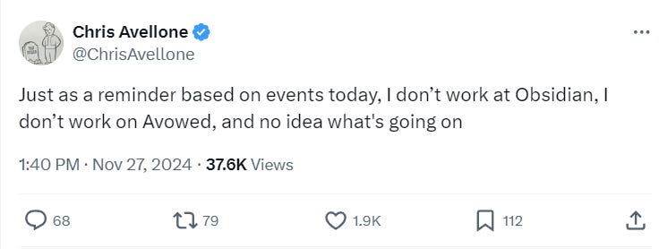 In another post, he clarified that he no longer works at Obsidian, “Just as a reminder based on events today, I don’t work at Obsidian, I don’t work on Avowed, and no idea what's going on.”