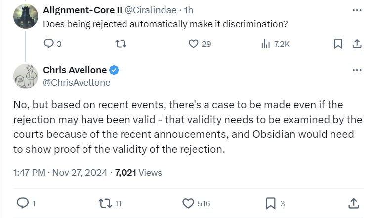 He replied, “No, but based on recent events, there's a case to be made even if the rejection may have been valid - that validity needs to be examined by the courts because of the recent annoucements, and Obsidian would need to show proof of the validity of the rejection.”