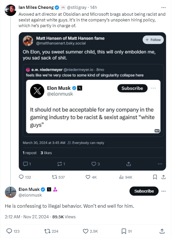 He also posted in March to BlueSky that Elon Musk saying that “it should not be acceptable for any company in the gaming industry to be racist & sexist against ‘white guys’ it would “only embolden me.”