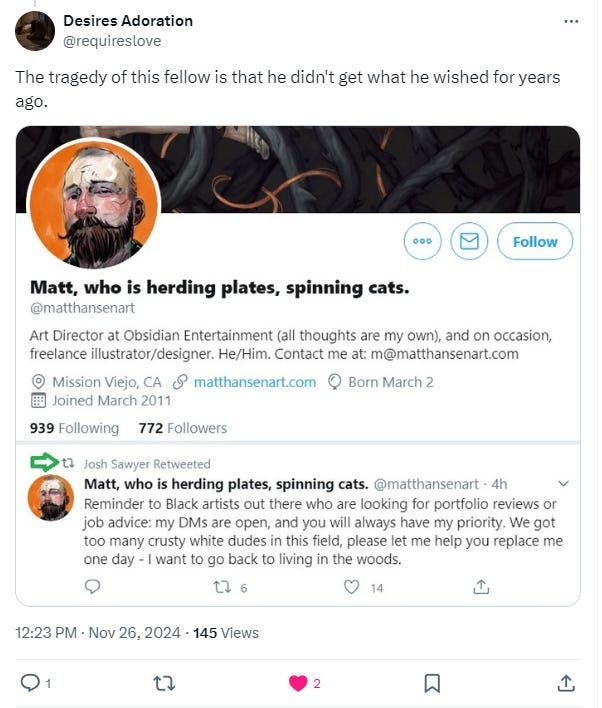 Hansen previously posted on X, “Reminder to Black artists out there who are looking for portfolio reviews or job advice: my DMs are open, and you will always have my priority.”