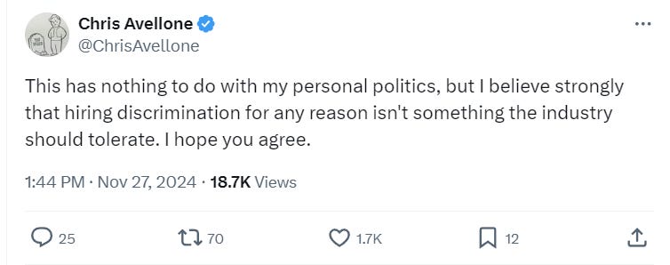 He added, “This has nothing to do with my personal politics, but I believe strongly that hiring discrimination for any reason isn't something the industry should tolerate. I hope you agree.”