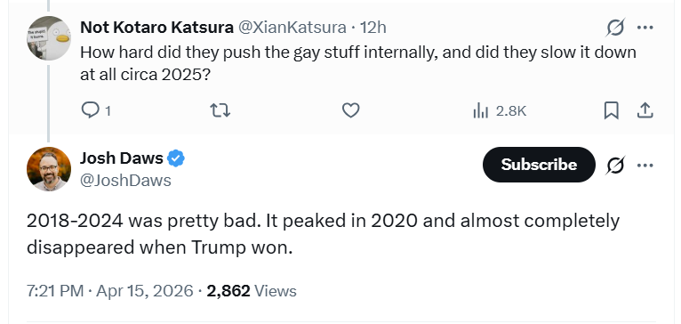 After being laid off, Daws conducted an impromptu Ask Me Anything on X, where he was first asked about how hard the company pushed the LGBTQ+ agenda internally and if it slowed down in 2025.