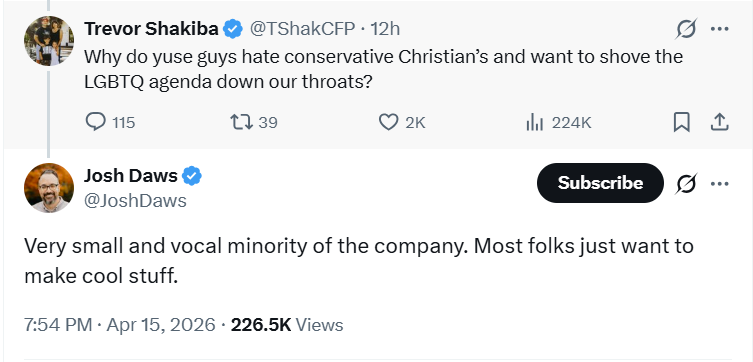 Additionally, he later shared that the people pushing this agenda are a “very small and vocal minority of the company. Most folks just want to make cool stuff.”