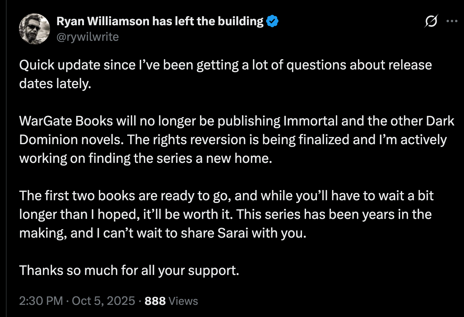 Former Wargate books military science fiction author Ryan Williamson has announced that after fighting with most of his audience on X, he’s throwing in the towel and flouncing for BlueSky.