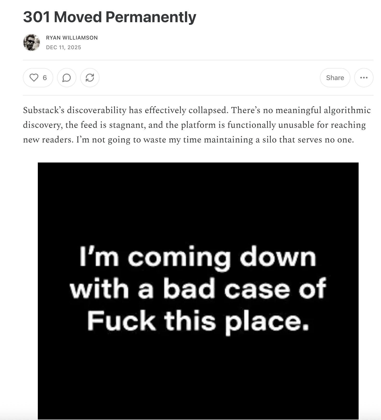 He posted, “Substack’s discoverability has effectively collapsed. There’s no meaningful algorithmic discovery, the feed is stagnant, and the platform is functionally unusable for reaching new readers. I’m not going to waste my time maintaining a silo that serves no one.”