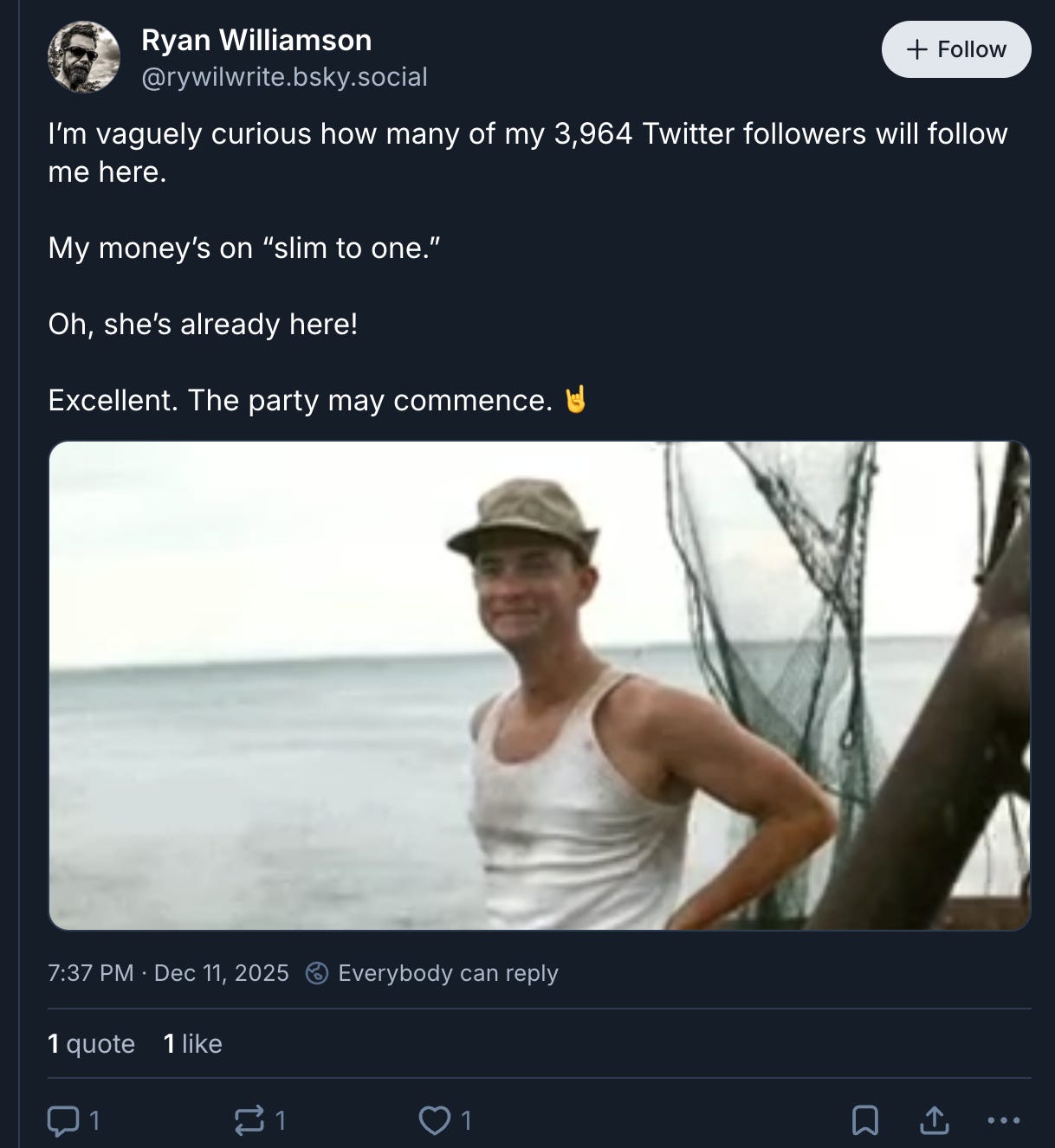 So, where will Williamson be going in hopes of selling his military sci-fi and fantasy books? Bluesky, for what he says is “daily presence, witty banter, updates, water cooler stuff.”