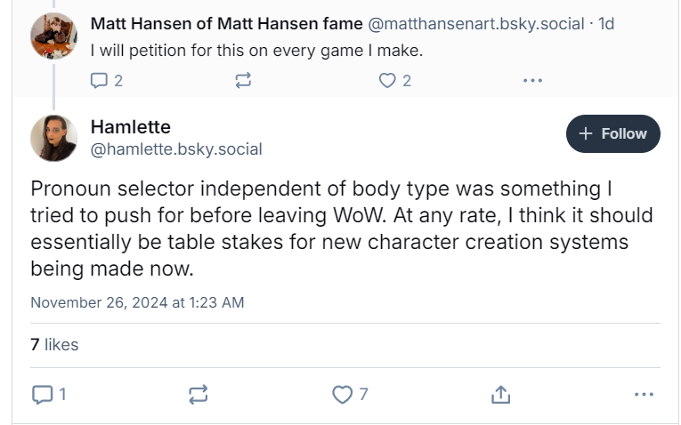 Hamlette then added, “Pronoun selector independent of body type was something I tried to push for before leaving WoW. At any rate, I think it should essentially be table stakes for new character creation systems being made now.”