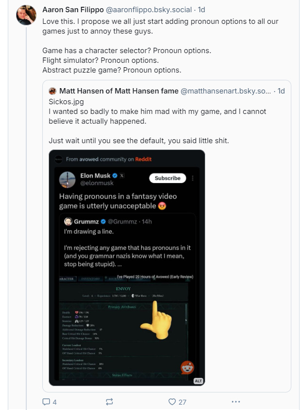 Filippo wrote, “Love this. I propose we all just start adding pronoun options to all our games just to annoy these guys. Game has a character selector? Pronoun options. Flight simulator? Pronoun options. Abstract puzzle game? Pronoun options.”