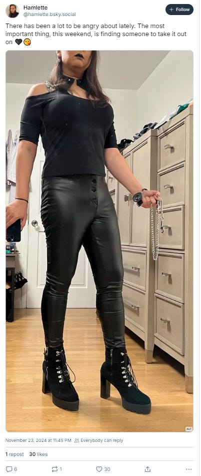 Of note, Hamlette appears to be wildly unstable. On November 23rd, he posted to BlueSky, “There has been a lot to be angry about lately. The most important thing, this weekend, is finding someone to take it out on.”