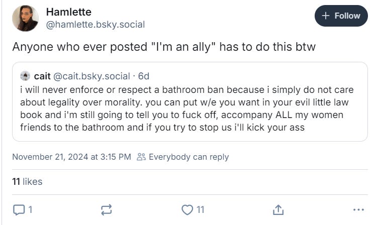 On November 21st, he also reposted another user who wrote, “i will never enforce or respect a bathroom ban because i simply do not care about legality over morality. you can put w/e you want in your evil little law book and i'm still going to tell you to fuck off, accompany ALL my women friends to the bathroom and if you try to stop us i'll kick your ass.”