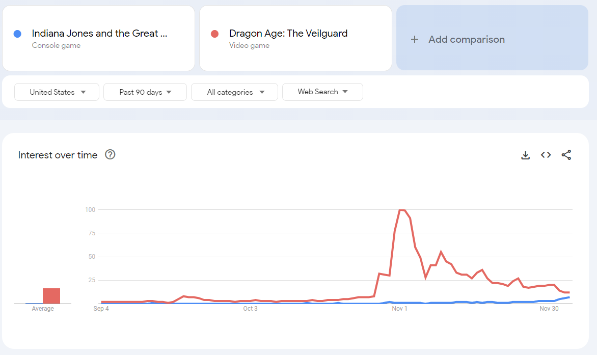 If you look at Google Trends, the game is performing significantly than Dragon Age: The Veilguard when looking at Google Trends. For reference, Dragon Age: The Veilguard released on October 31st, where it hit its peak interest.