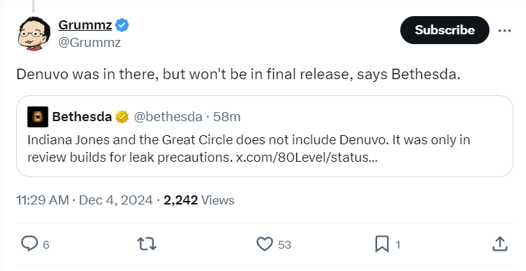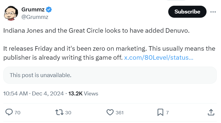 In a post to X, Grummz wrote, “Indiana Jones and the Great Circle looks to have added Denuvo.”
