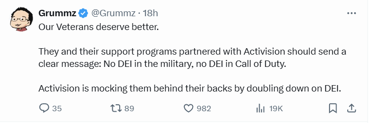 Grummz also posted, “Our Veterans deserve better. They and their support programs partnered with Activision should send a clear message: No DEI in the military, no DEI in Call of Duty. Activision is mocking them behind their backs by doubling down on DEI.”