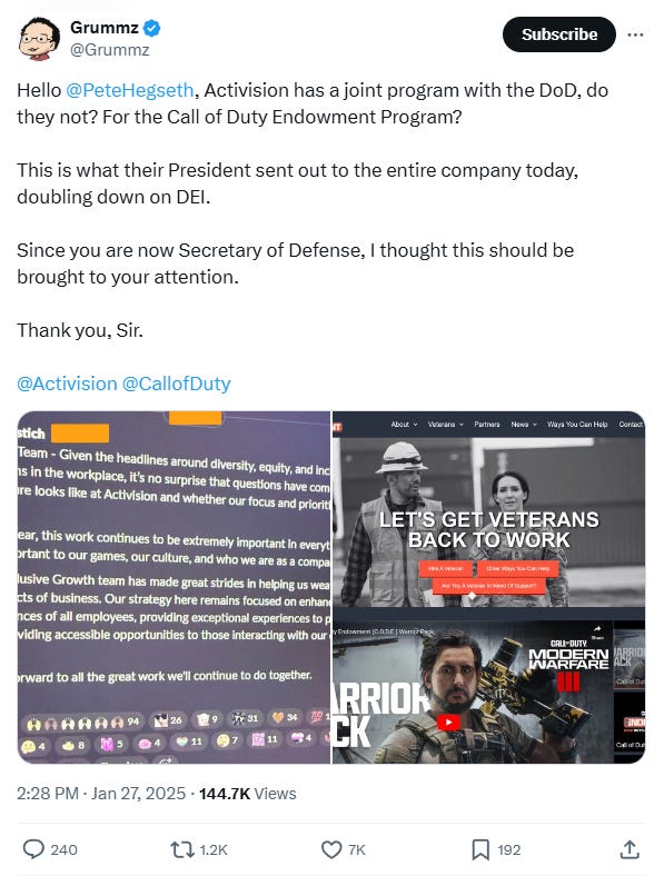 He wrote, “Hello Pete Hegseth, Activision has a joint program with the DoD, do they not? For the Call of Duty Endowment Program? This is what their President sent out to the entire company today, doubling down on DEI. Since you are now Secretary of Defense, I thought this should be brought to your attention. Thank you, Sir.”