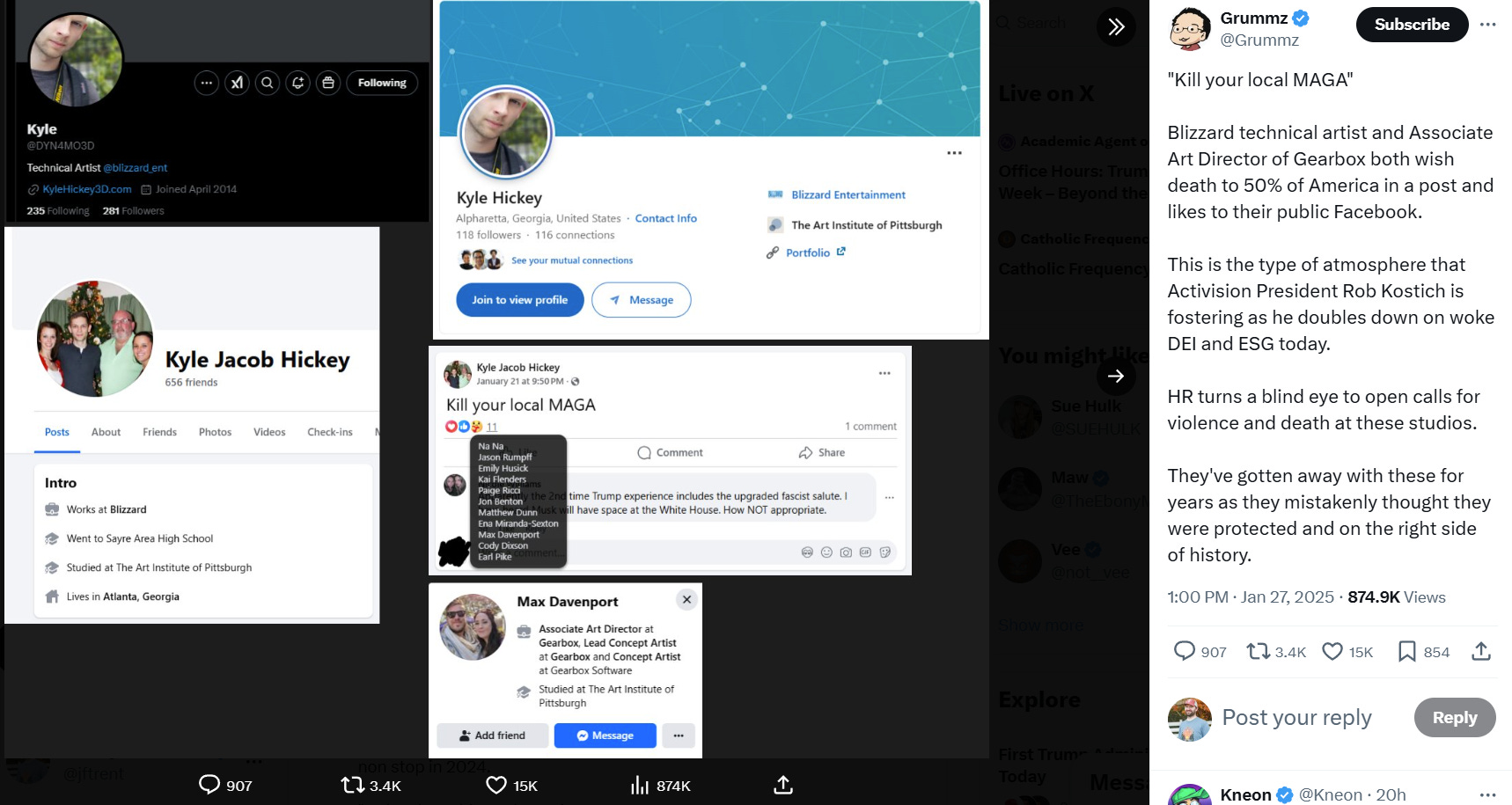 On top of this Grummz shared that Blizzard Technical Artist Kyle Hickey recently wrote on his Facebook page, “Kill your local MAGA.”