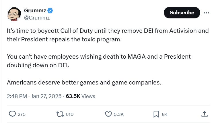 Grummz wrote on X, “It's time to boycott Call of Duty until they remove DEI from Activision and their President repeals the toxic program.”