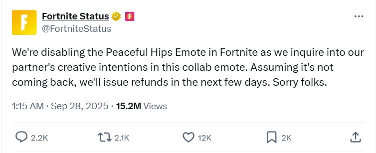 Fortnite announced on X, the emote was disabled and it was investigating DC’s intentions of the emote. The company wrote, “We’re disabling the Peaceful Hips Emote in Fortnite as we inquire into our partner’s creative intentions in this collab emote.”