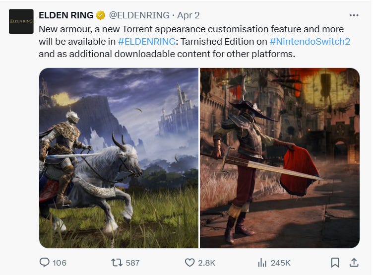 It was previously announced in April that the Tarnished Edition would arrive sometime this year on Nintendo Switch and would include the base game as well as the Shadow of the Erdtree expansion and more.