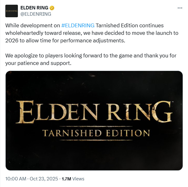 The company announced the delay on social media writing, “While development on Elden Ring Tarnished Edition continues wholeheartedly toward release, we have decided to move the launch to 2026 to allow time for performance adjustments.”