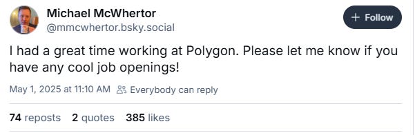 Correspondent Michael McWhertor also confirmed he was laid off too, “I had a great time working at Polygon. Please let me know if you have any cool job openings!”
