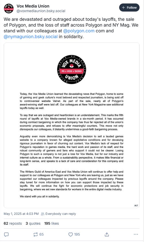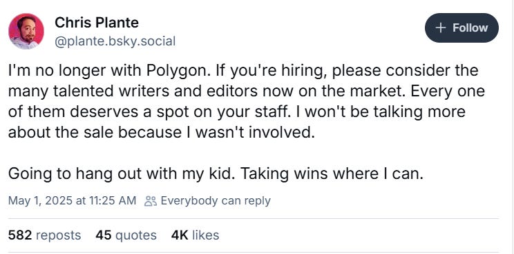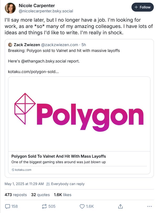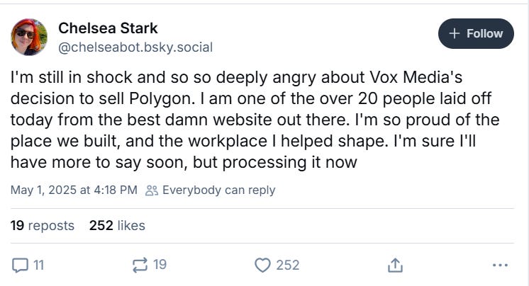 She wrote on BlueSky, “I'm still in shock and so so deeply angry about Vox Media's decision to sell Polygon. I am one of the over 20 people laid off today from the best damn website out there. I'm so proud of the place we built, and the workplace I helped shape. I'm sure I'll have more to say soon, but processing it now.”