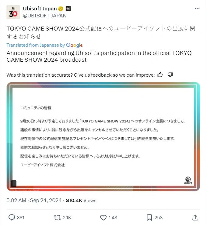 This week, it was reported that Ubisoft is pulling out of the Tokyo Game Show. Ubisoft Japan stated on X, “Regarding our planned online participation in Tokyo Game Show 2024 scheduled for September 26th at 15:00, we regret to inform you that we had to cancel our exhibition due to various circumstances.”