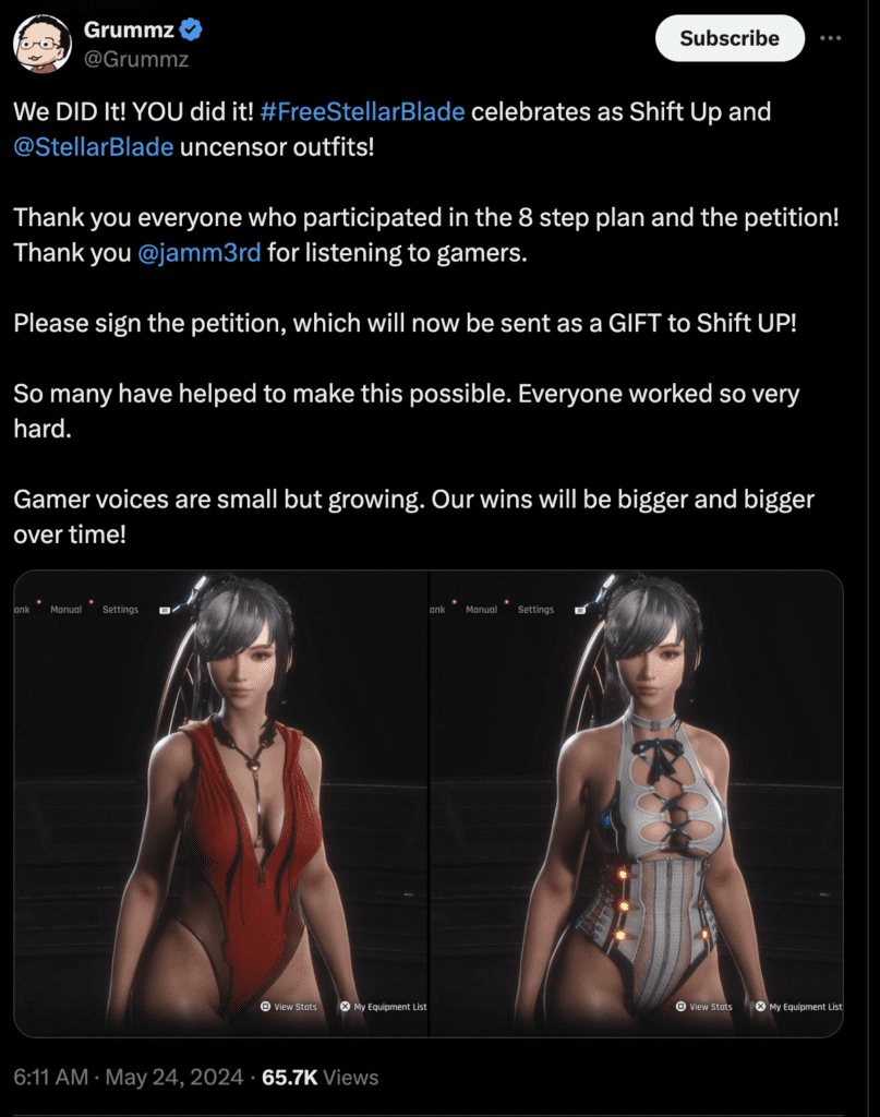 Now, gamers win again as Free Stellar Blade made Shift Up move to uncensor the outfits. Grummz posted to X this morning, “We DID It! YOU did it! #FreeStellarBlade celebrates as Shift Up and @StellarBlade uncensor outfits! Thank you everyone who participated in the 8 step plan and the petition! Thank you @jamm3rd for listening to gamers.Please sign the petition, which will now be sent as a GIFT to Shift UP! So many have helped to make this possible. Everyone worked so very hard! Gamer voices are small but growing. Our wins will be bigger and bigger over time!”
