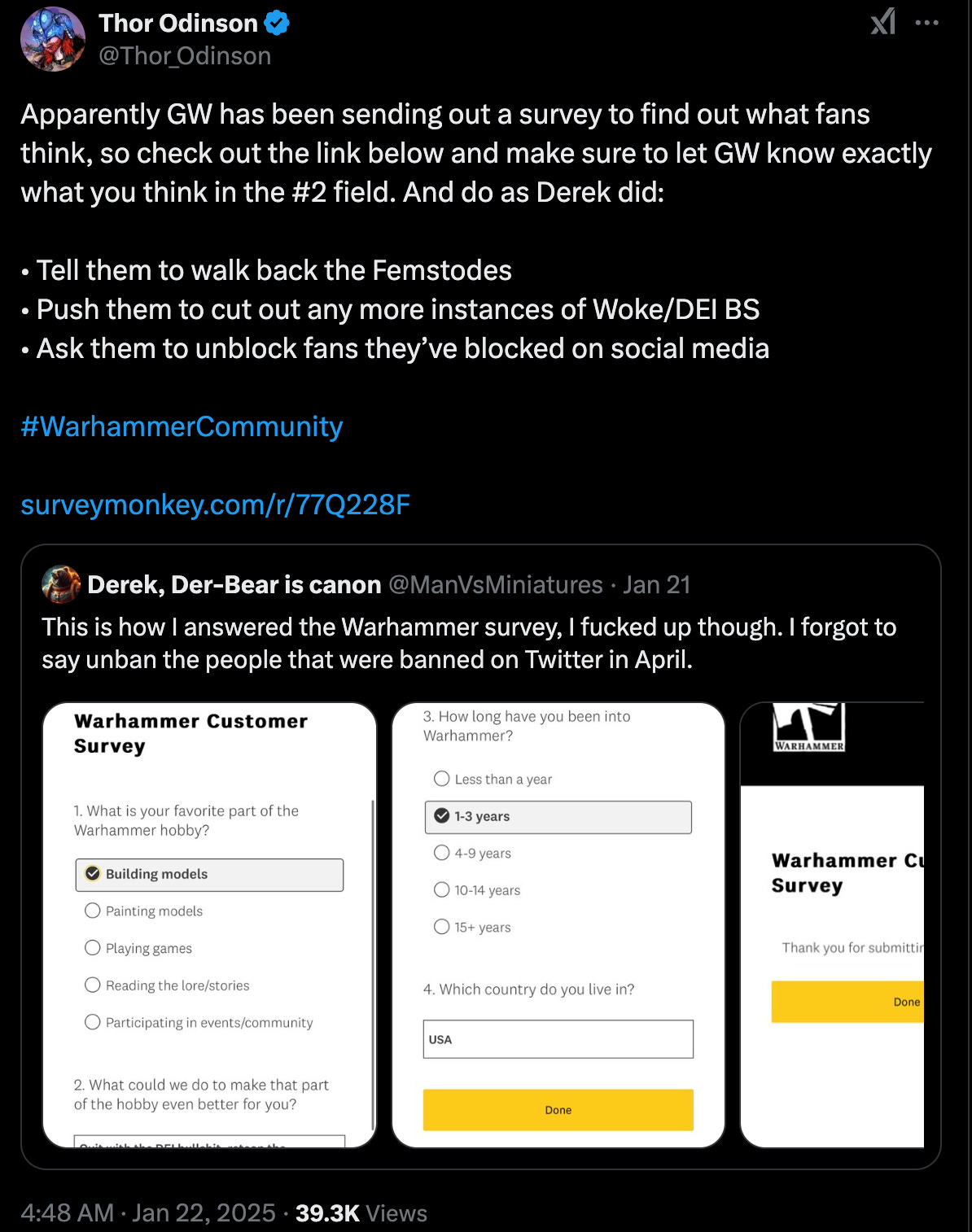 Warhammer enthusiast @Thor_Odisnon quote tweeted the survey with a call to action that went viral among Warhammer 40K fans. He said, “Apparently GW has been sending out a survey to find out what fans think, so check out the link below and make sure to let GW know exactly what you think in the #2 field. And do as Derek did: • Tell them to walk back the Femstodes • Push them to cut out any more instances of Woke/DEI BS • Ask them to unblock fans they’ve blocked on social media.”