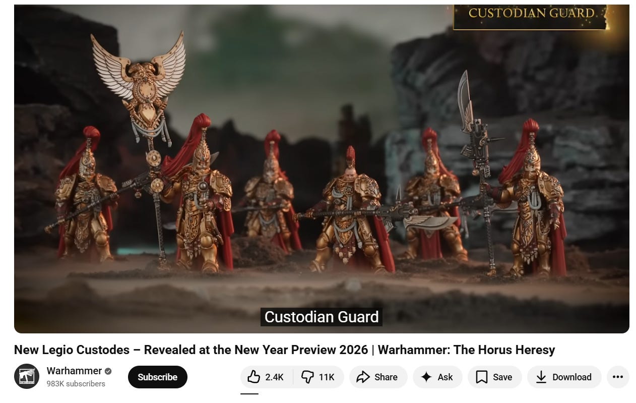 A video highlighting the new Legio Custodes miniatures has just 2,400 likes compared to an estimated 11,000 dislikes.
