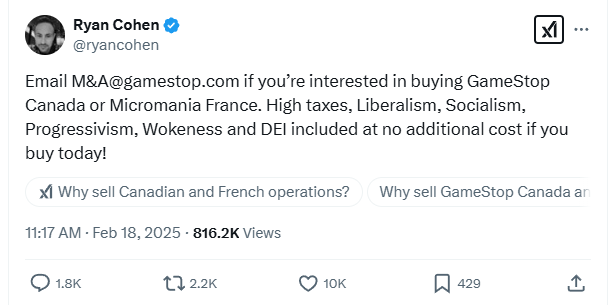 Cohen wrote on X, “Email M&A@gamestop.com if you’re interested in buying GameStop Canada or Micromania France. High taxes, Liberalism, Socialism, Progressivism, Wokeness and DEI included at no additional cost if you buy today!”
