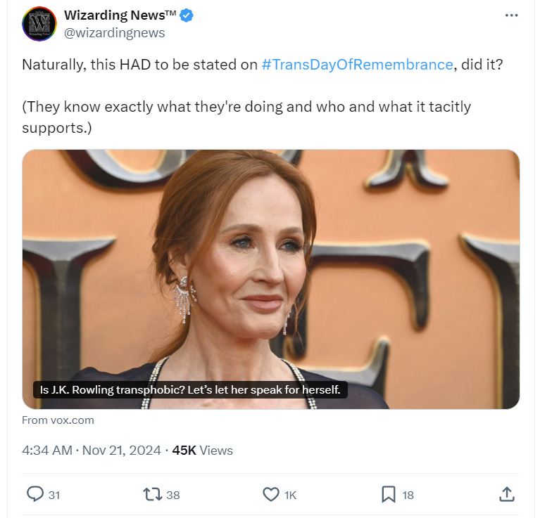 Wizarding News, which has been threatened with legal action by Rowling, bemoaned, “Naturally, this HAD to be stated on #TransDayOfRemembrance, did it? (They know exactly what they're doing and who and what it tacitly supports.)