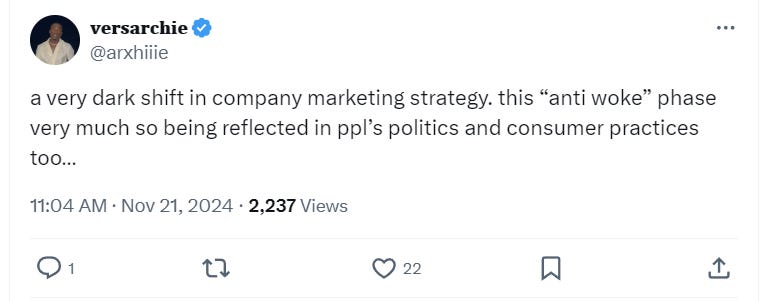 Another wrote, “a very dark shift in company marketing strategy. this ‘anti woke’ phase very much so being reflected in ppl’s politics and consumer practices too…”