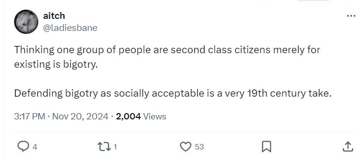ladiesbane seethed, “Thinking one group of people are second class citizens merely for existing is bigotry. Defending bigotry as socially acceptable is a very 19th century take.”