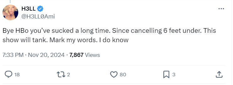 H3LL0Ami wrote, “Bye HBo you’ve sucked a long time. Since cancelling 6 feet under. This show will tank. Mark my words. I do know”