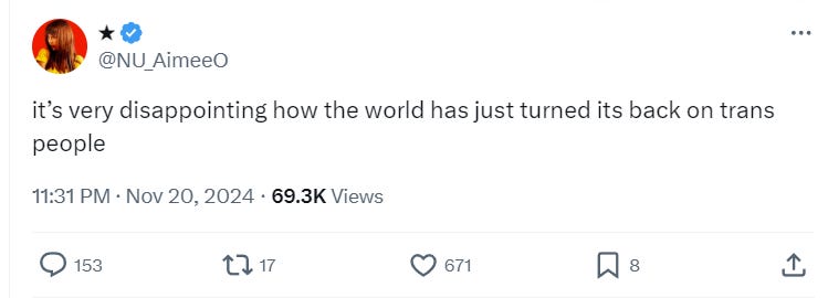 NU_AimeeO posted, “it’s very disappointing how the world has just turned its back on trans people.”
