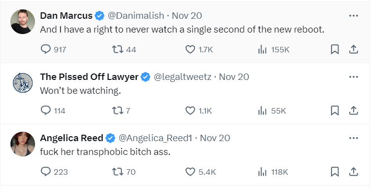 Dan Marcus wrote, “And I have a right to never watch a single second of the new reboot.”