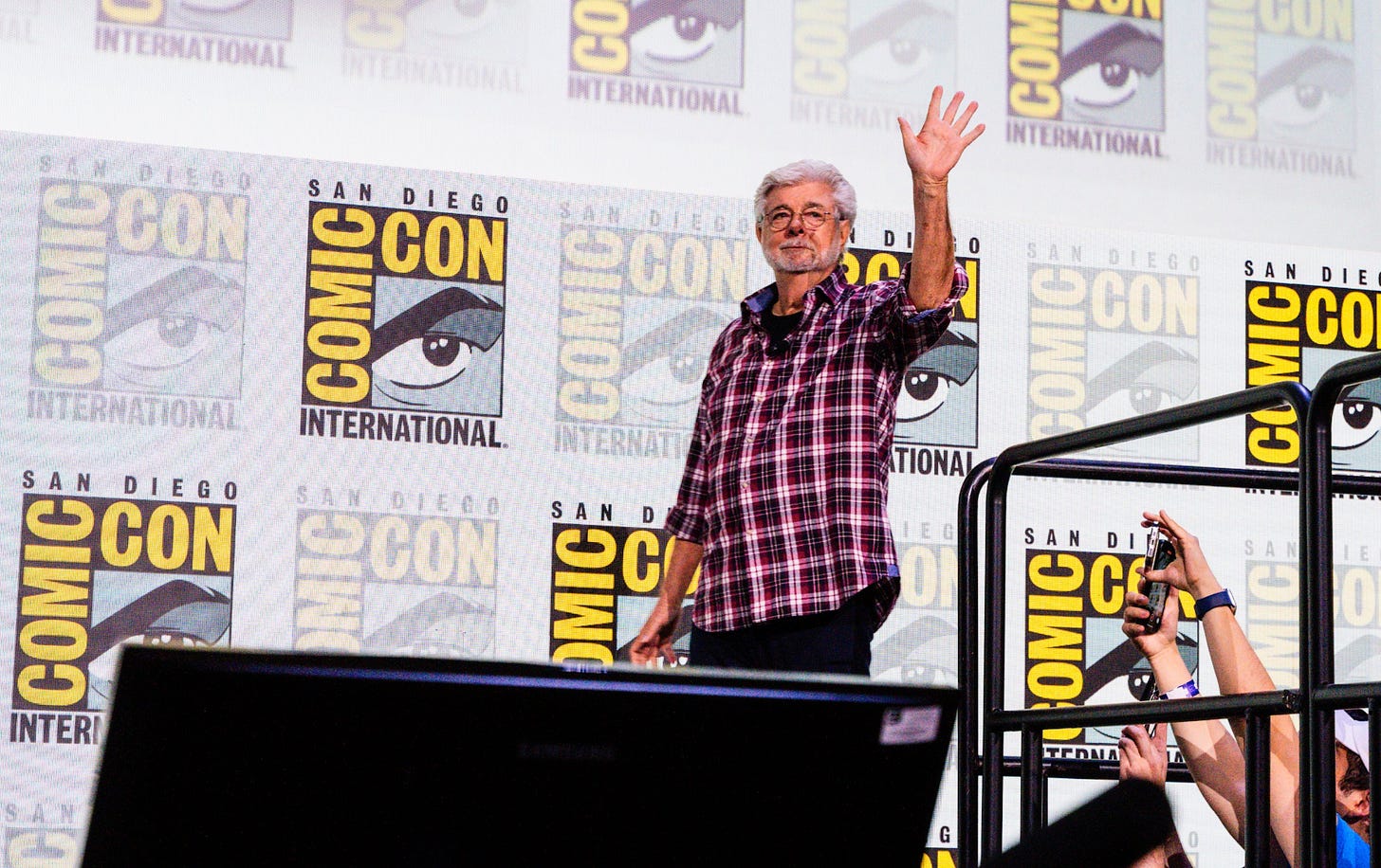George Lucas made his first-ever appearance at San Diego Comic-Con Sunday morning, joining three-time Oscar winner Guillermo del Toro and production designer Doug Chiang in Hall H to preview the upcoming Lucas Museum of Narrative Art. For a creator who built the modern blockbuster era yet never attended the world's largest pop culture convention, even d…