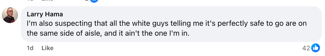 He also doubled down, “I'm also suspecting that all the white guys telling me it's perfectly safe to go are on the same side of aisle, and it ain't the one I'm in.”
