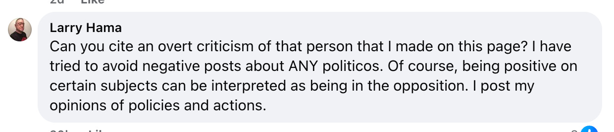 In a comment on the same post, Hama played dumb as if he somehow were not critical of Donald Trump, “Can you cite an overt criticism of that person that I made on this page? I have tried to avoid negative posts about ANY politicos. Of course, being positive on certain subjects can be interpreted as being in the opposition. I post my opinions of policies and actions.”