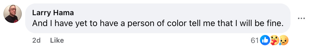 He then showed his true colors in his own comment to his post, “And I have yet to have a person of color tell me that I will be fine.”