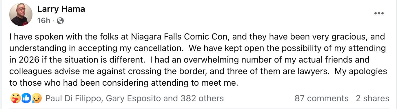 After a long thread, he then canceled his appearance to go to Canada out of his self-inflicted fear, “I have spoken with the folks at Niagara Falls Comic Con, and they have been very gracious, and understanding in accepting my cancellation. We have kept open the possibility of my attending in 2026 if the situation is different. I had an overwhelming number of my actual friends and colleagues advise me against crossing the border, and three of them are lawyers. My apologies to those who had been considering attending to meet me.”