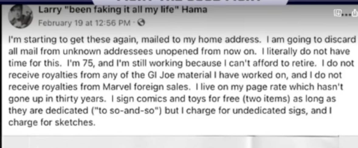 In a Facebook post last year, Hama declared why he’s still working saying, “I’m 75, and I’m still working because I can’t afford to retire. I do not receive royalties from any of the GI Joe material I have worked on, and I do not receive royalties from Marvel foreign sales. I live on my page rate which hasn’t gone up in thirty years.”